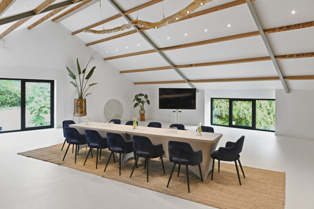 De grote zaal. Warm daglicht door hoge ramen, natuurlijke materialen, akoestiek die stilte versterkt. Ruimte voor grote groepen zonder dat het groot voelt.